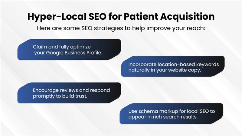 Patients often search with intent and location, such as “primary care clinic in Los Angeles” or “medical billing services near me.”