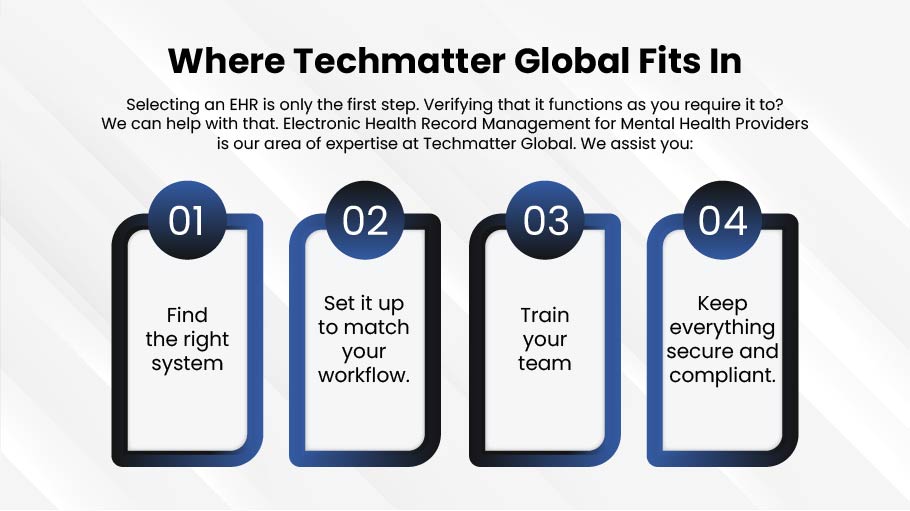 At Techmatter Global, we understand that choosing the right electronic health records system isn’t just a tech decision—it’s a strategic move that affects your entire organization. From consultation and system selection to implementation, training, and long-term support, we offer comprehensive solutions tailored to your unique needs.