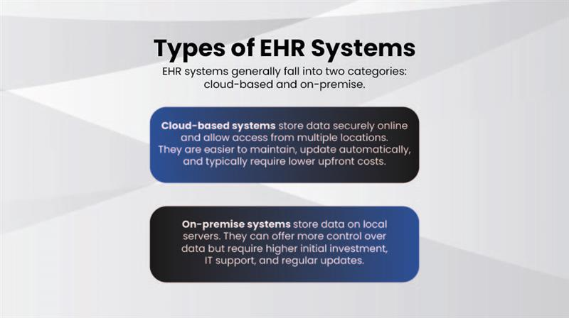 EHR systems generally fall into two categories: cloud-based and on-premise.